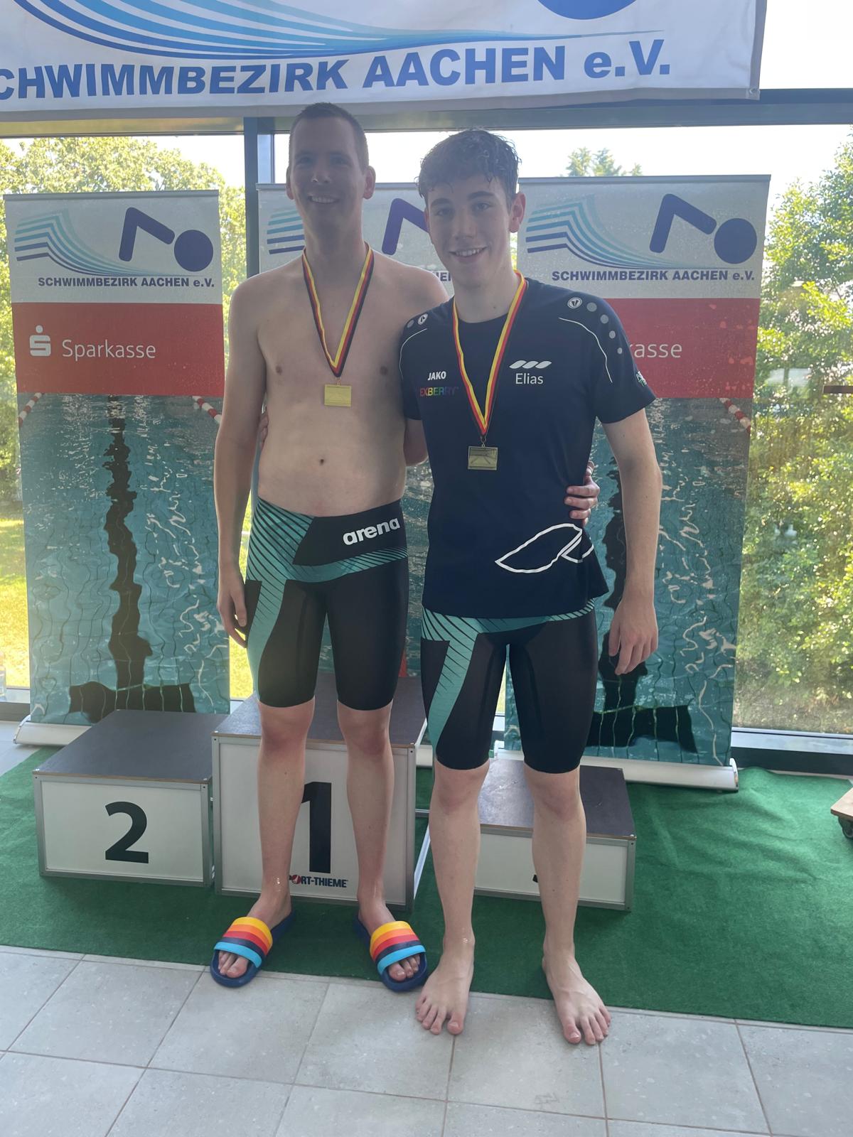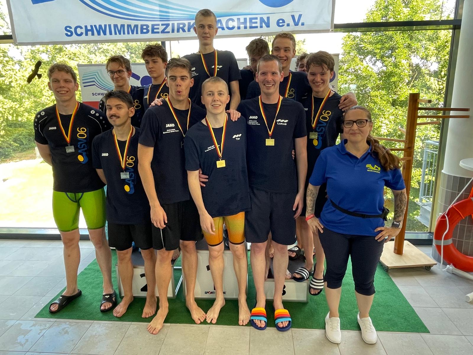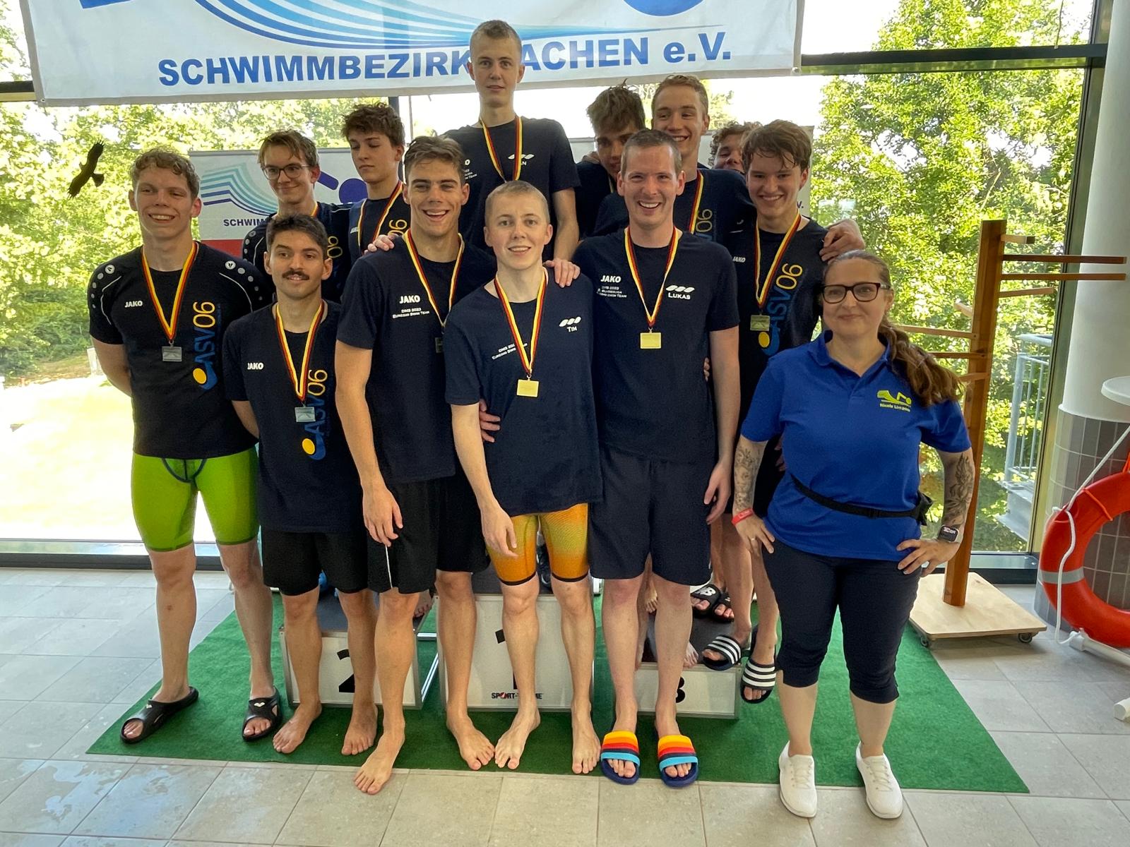 Mit den Bezirksmeisterschaften auf der langen Bahn im Dürener Rurbad erfüllten unsere 22 Schwimmerinnen und Schwimmer ihre letzte Mission vor der Sommerpause. Bei insgesamt 112 Einzelstarts und zehn Staffeln schwammen sie im Medaillenspiegel der offenen Klasse (Jahrgang 2006 und älter) an die Spitze mit achtmal Gold, sechsmal Silber und viermal Bronze. Auf Rang zwei folgten die Wasserfreunde Delphin Eschweiler und Dritter wurde der Aachener SV. 19 Gold-, 13 Silber- und fünf Bronzemedaillen brachten für die Athletinnen und Athleten in den Jahrgangswertungen (Jahrgänge 2007/2008 bis 2013) Rang vier (1. Aachener SV 06, 2. Dürener TV, 3. SV Übach-Palenberg). Mit reichlich Edelmetall stiegen die Masters (ab Altersklasse 20) aus dem Pool und belegten hinter dem Brander SV und vor dem Dürener TV den zweiten Platz im Medaillenspiegel. Die Leistungen unserer Aktiven zählten umso mehr, da die Sportlerinnen und Sportlern seit Anfang April ohne heimische Schwimmhalle auf dem Trockenen sitzen.