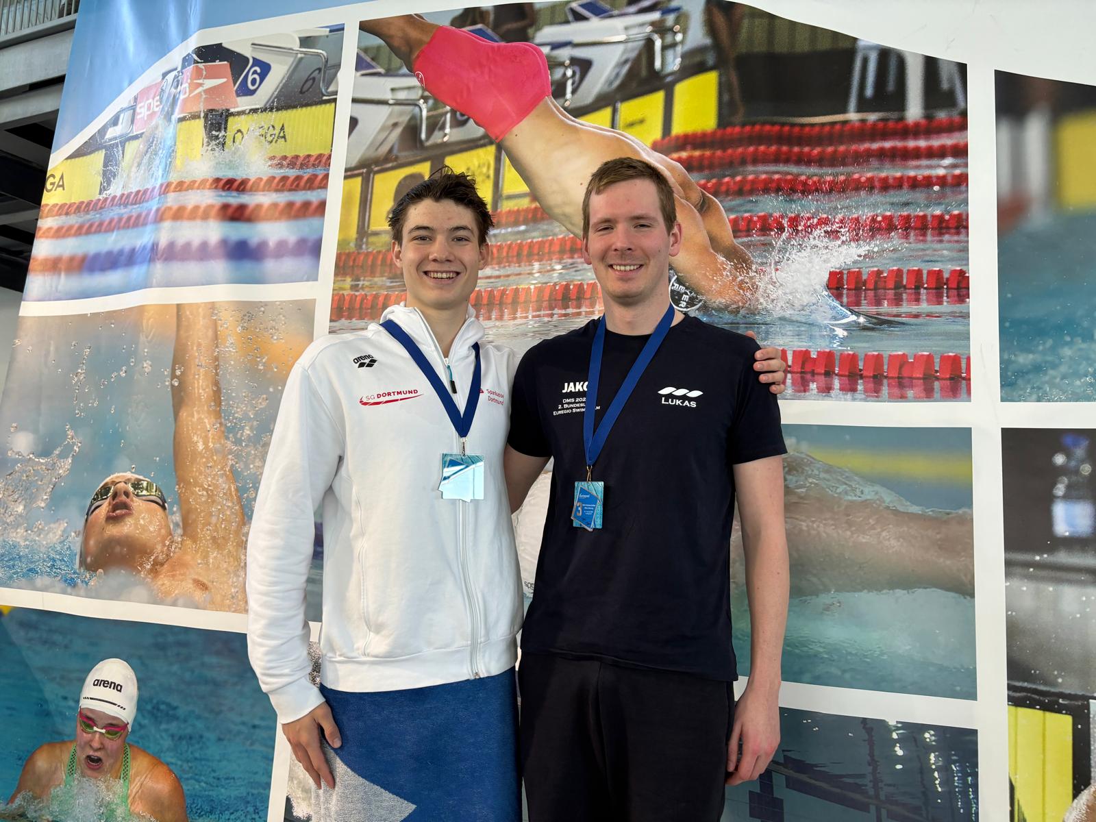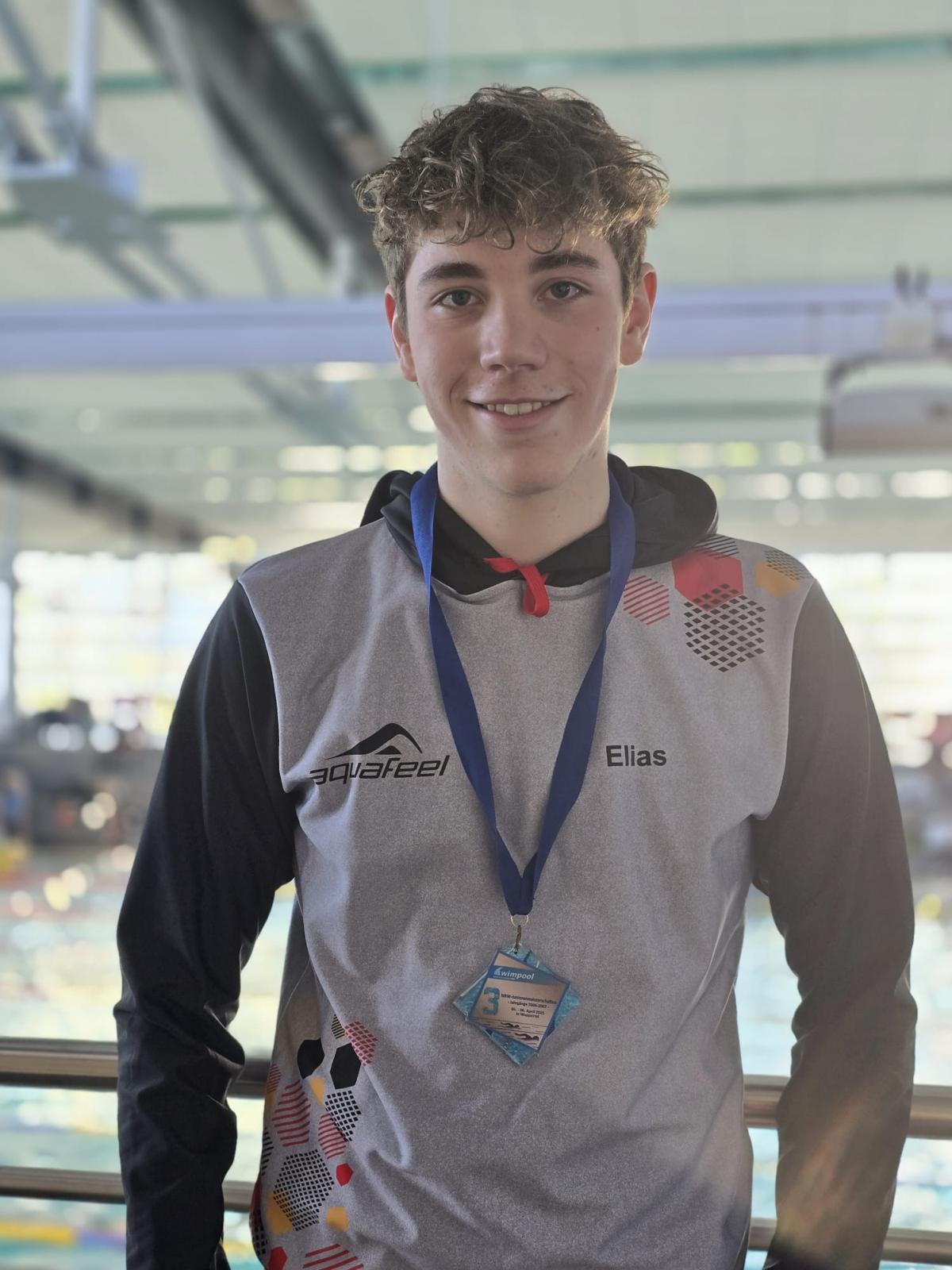 Da freute sich Elias (Jahrgang 2007) bei den NRW-Meisterschaften ganz besonders über seinen ersten Sprung aufs Podest der Landesebene. In 02:31,41 Minuten schmetterte er über 200 Meter zur Bronzemedaille in der Juniorenwertung. Über 400 Meter Freistil schwamm er auf Platz 7. In dieser Gruppe punktete auch Jan Schacht (Jahrgang 2007) über 50 Meter Freistil, 50 Meter Schmetterling und 100 Meter Freistil. Als Zehnter landete Jan über die längere Freistildistanz im Ranking der Top-Ten.